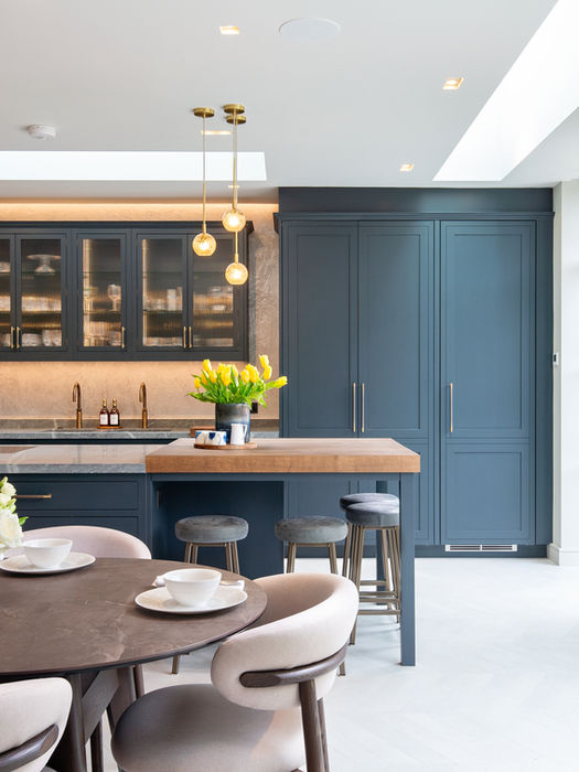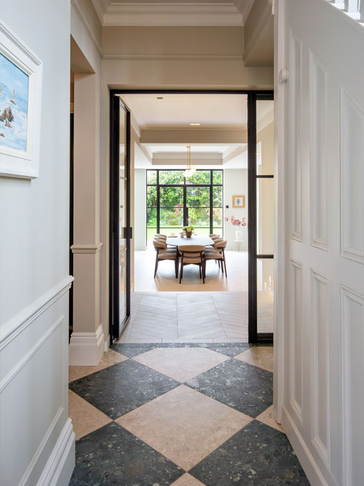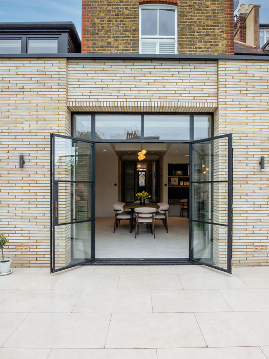 Crittal doors were installed to the open plan rear wall and internally so as to view the garden from the front door and bring the outside in. Details such as coffer ceilings, cornicing, underfloor heated tiles, butler’s pantry, and bespoke joinery with an integrated wine fridge and lighting were included.