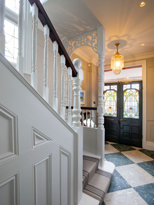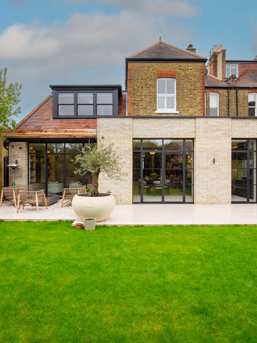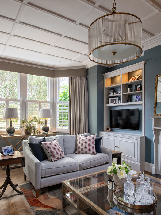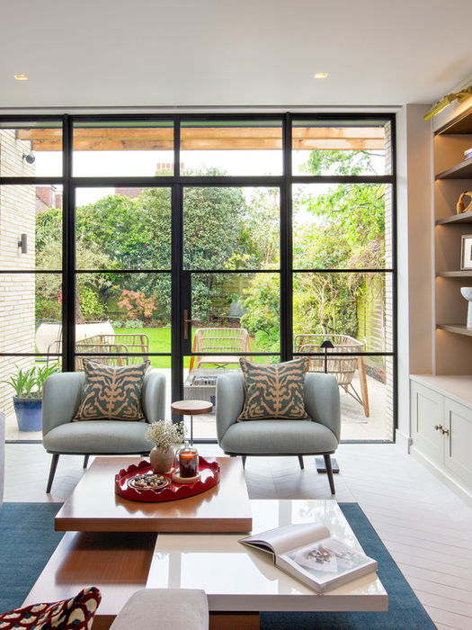 We added a boot room, washing room, and a new office with crittall screens and fitted joinery to maximise space and light. We remodelled the formal living room but kept original features such as the panelled ceiling, fireplace and bay window.